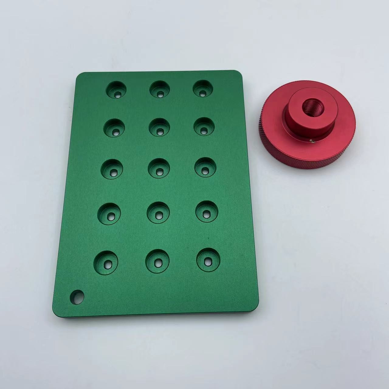 The green panel (with 15 precisely drilled holes) and red knurled component are made of high-grade aluminum, then treated with anodizing (for corrosion resistance and vibrant color) and sandblasting (for that smooth, matte texture). These finishes don’t just look sharp—they boost the parts’ lifespan, making them ideal for industrial fixtures, equipment assemblies, and precision tools.
